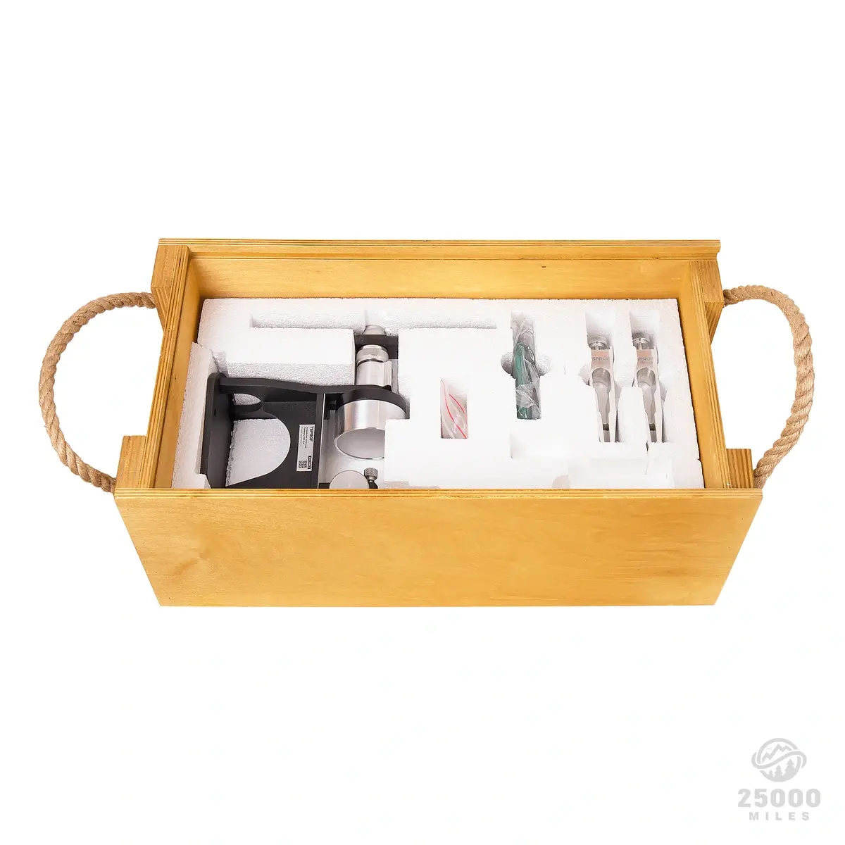The TSPROF K03 Pro “Base” Sharpening Kit package includes the Axicube-I angle finder and two whole-milled clamps. In addition, it comes equipped with spare parts, a sturdy steel stand and is meticulously packaged within a wooden shipping box with lodgements. This Sharpening System promises a comprehensive sharpening experience and ensures safe transit and efficient storage.